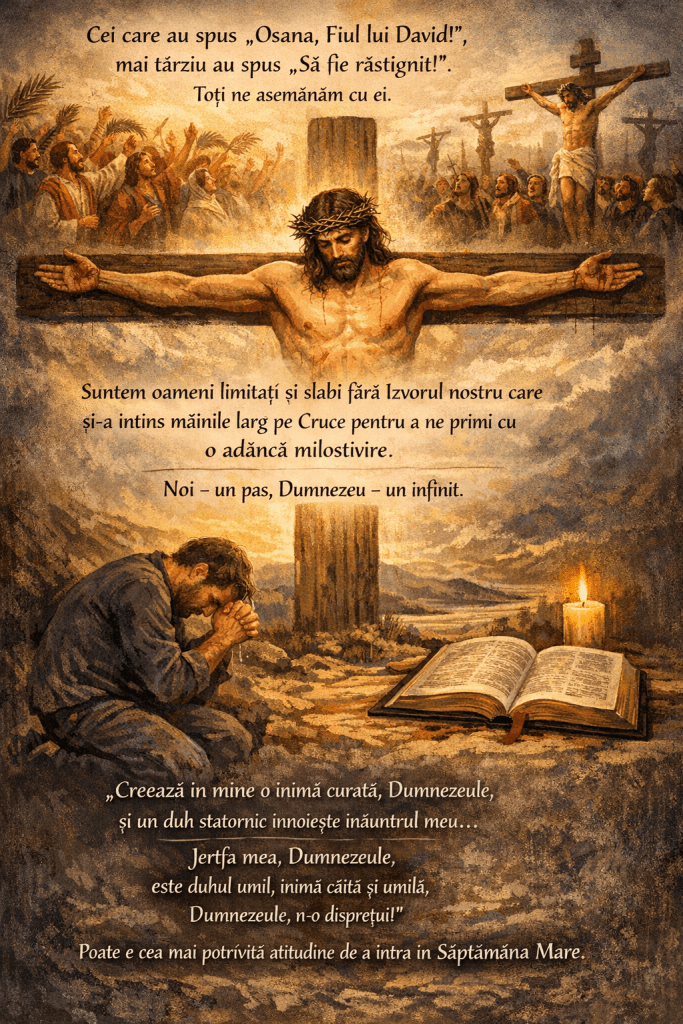 Dar, iată că unii, cum e psalmistul, după ce a căzut în adâncul uitării de Dumnezeu, a avut curajul să se întoarcă și să spună: „Creează în mine o inimă curată, Dumnezeule, și un duh statornic înnoiește înăuntrul meu…Jertfa mea, Dumnezeule, este duhul umil, inima căită și umilă, Dumnezeule, n-o disprețui!”. Poate e cea mai potrivită atitudine de a intra în Săptămâna Mare.